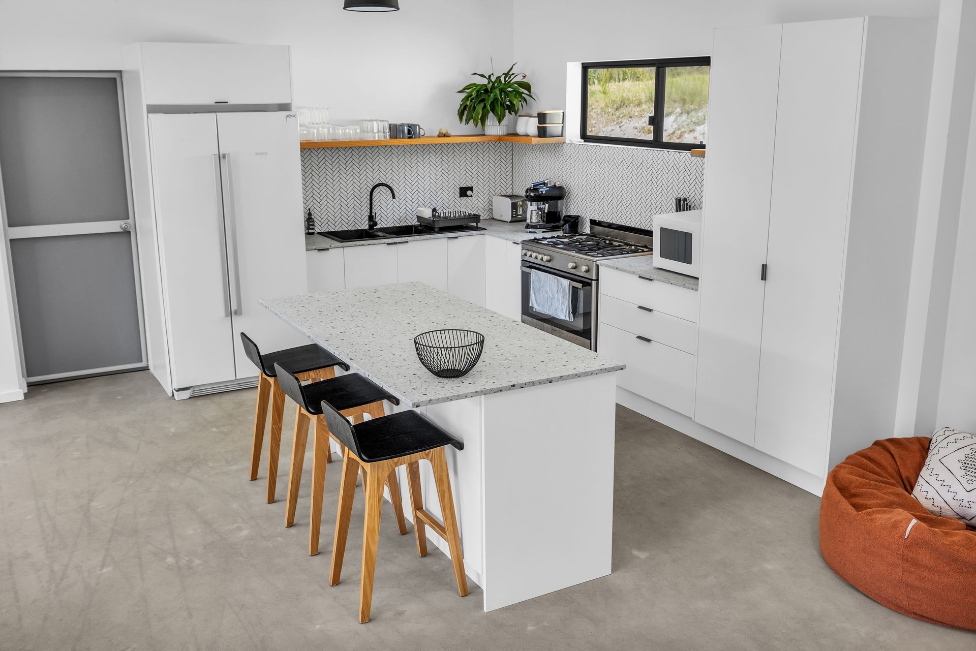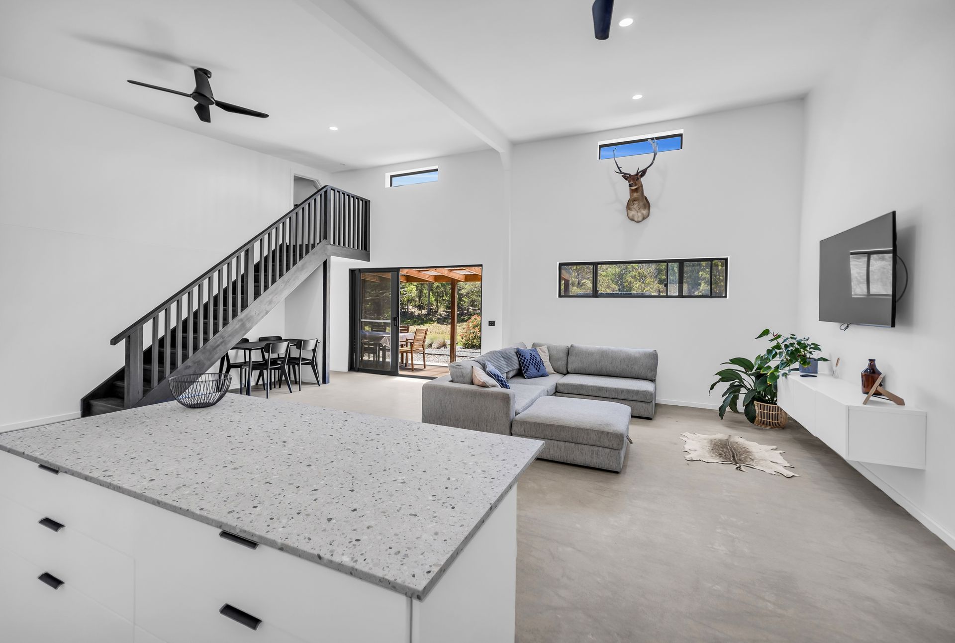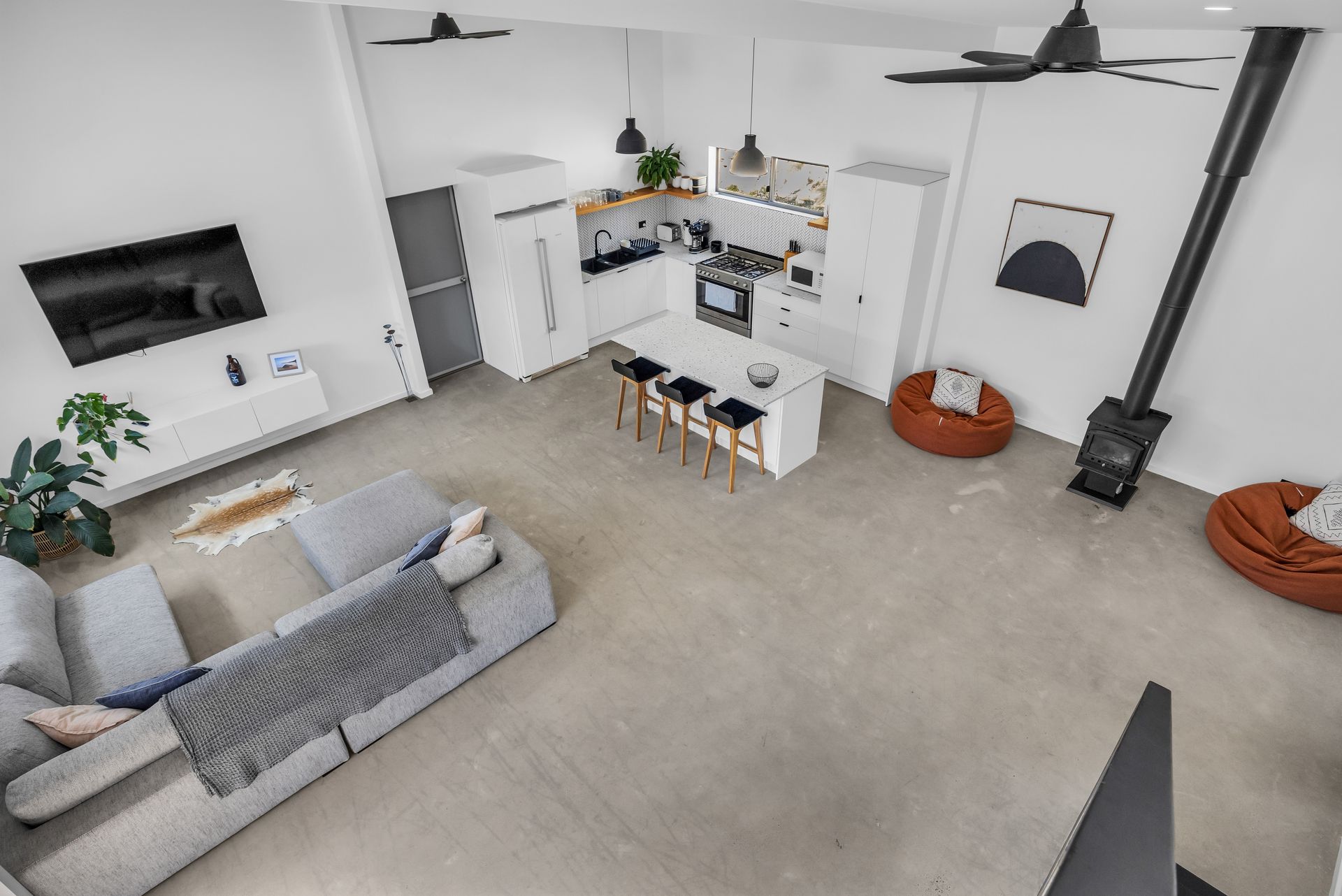 Open plan living with large lounge, smart TV, kitchen and dining areas with high end appliances, coffee machine, and slow combustion fire.