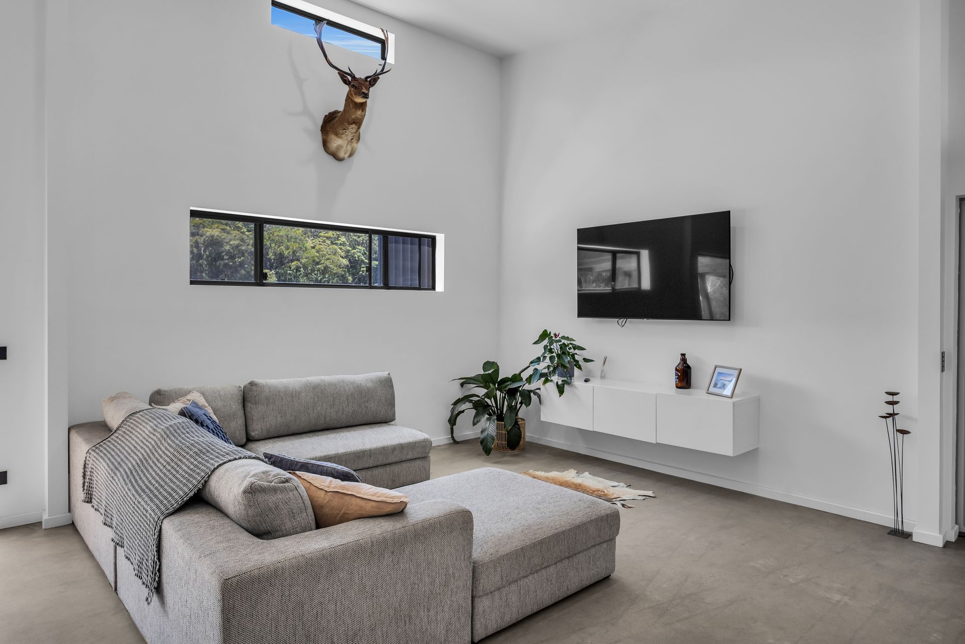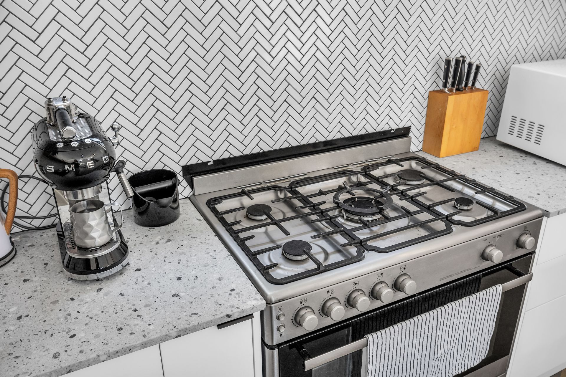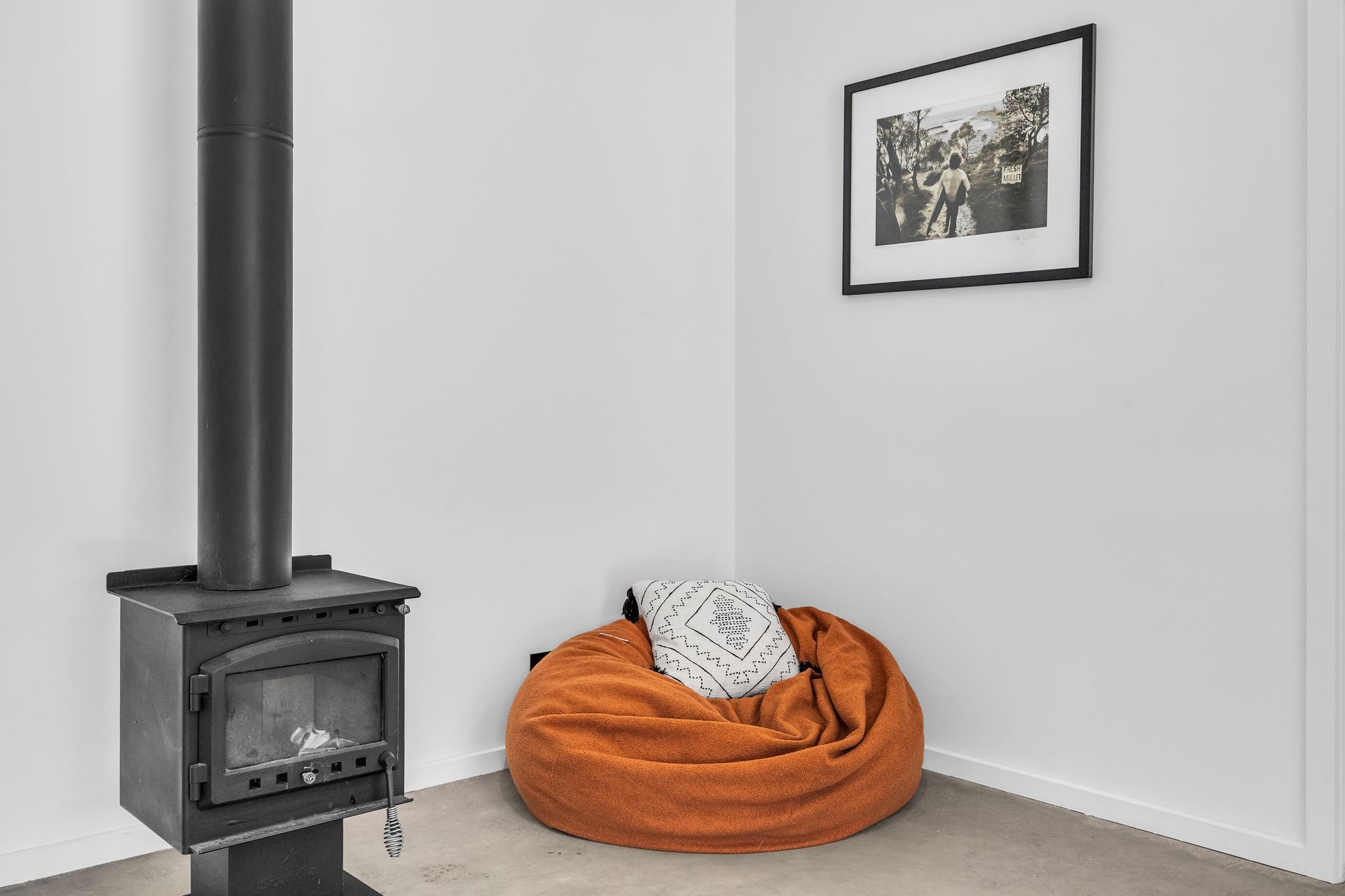 Open plan living with large lounge, smart TV, kitchen and dining areas with high end appliances, coffee machine, and slow combustion fire.