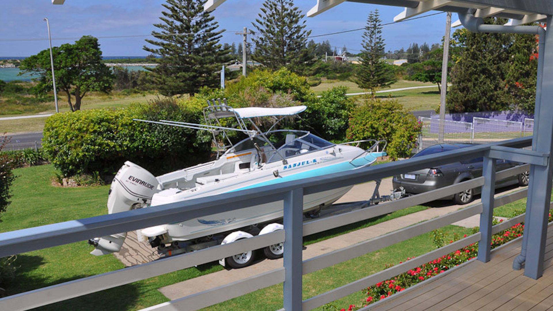 Magnificent ocean & river views in central location. Walking distance to shops, Country Club & beaches. Perfect for large families or fishing groups who want to share the same complex. Fully fenced yard shared with unit 2, ample boat parking.