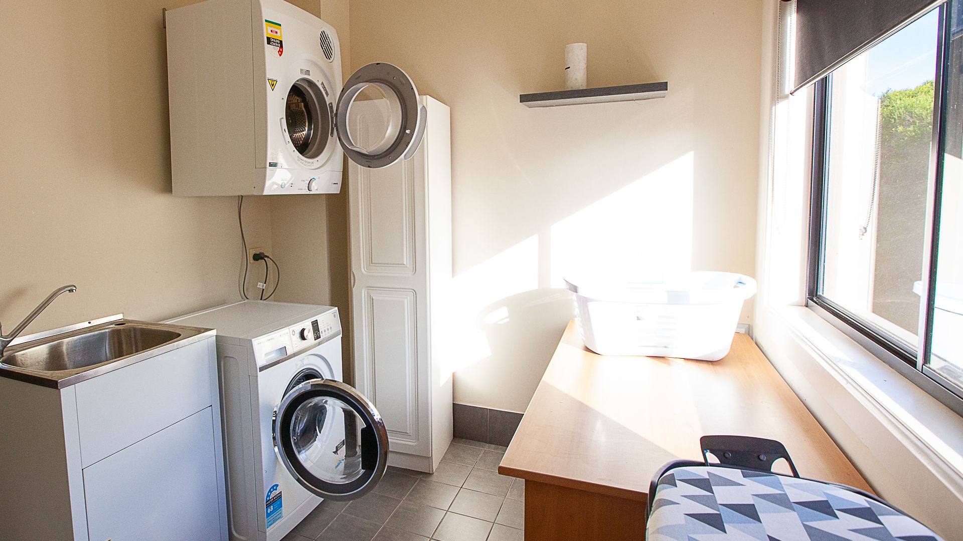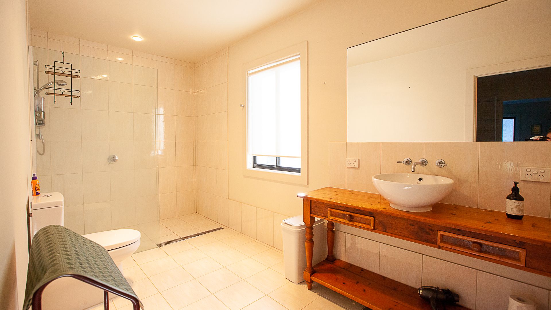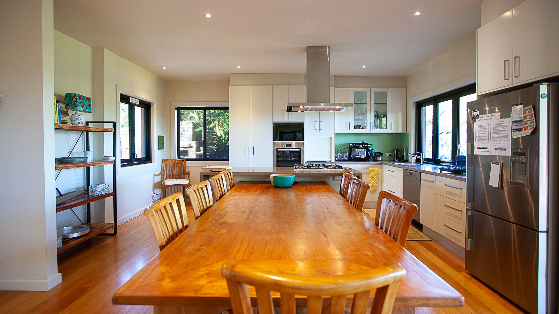 The house opens up into an open plan kitchen, dining and lounge area. The kitchen is fully equipped and modern. The windows open up to a servery bench placed on the gorgeous deck where you can sit to listen to the sound of the ocean.