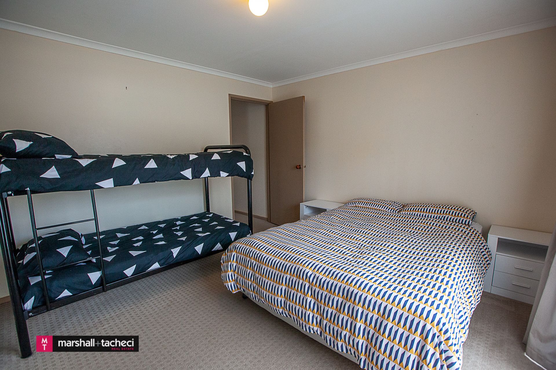 The main bedroom has a queen bed with electric blanket, Tv & bedside tables and lamps.