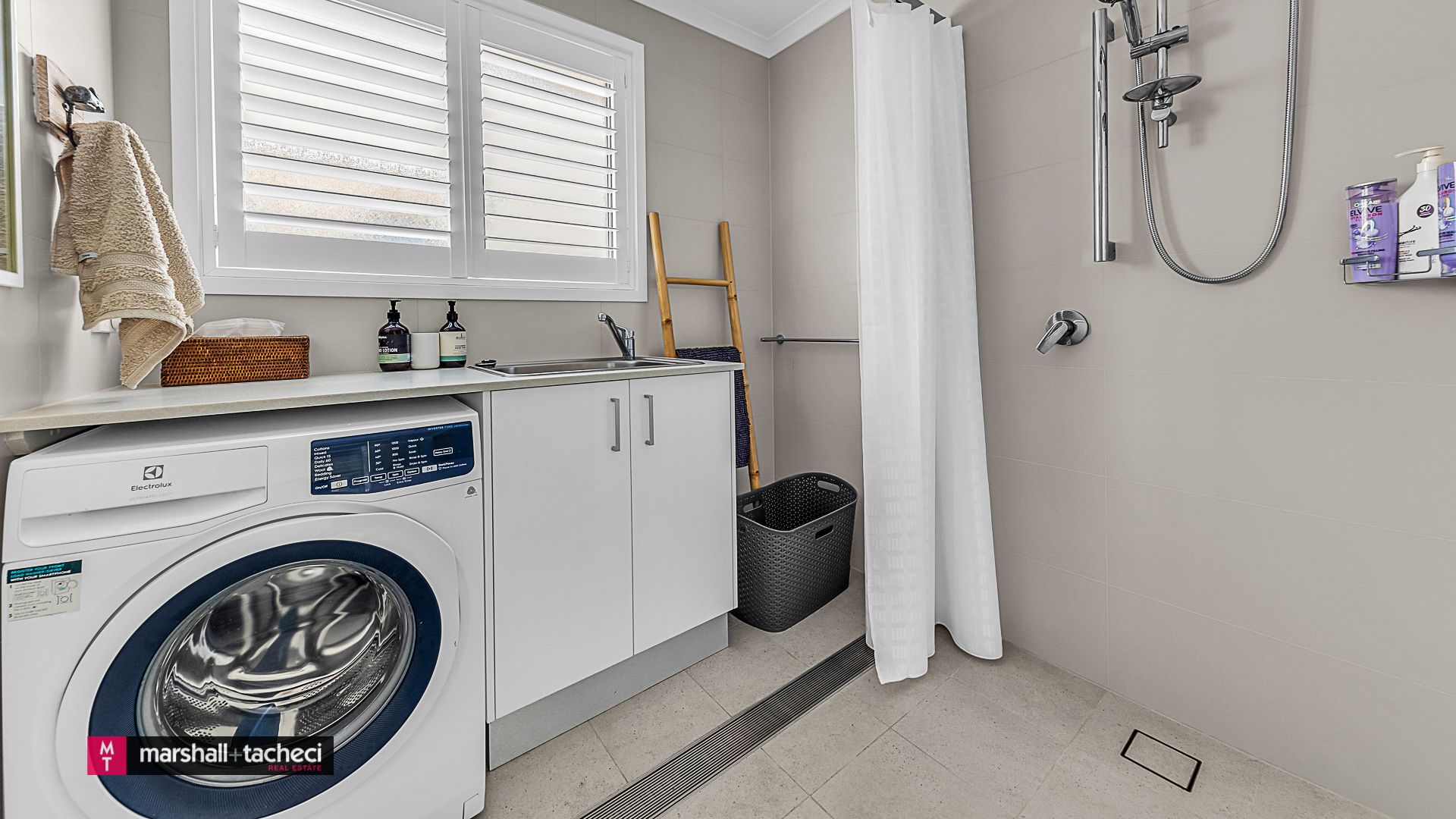 Bathroom/laundry Walkin shower, toilet, washing machine (dryer in garage) and laundry sink. This area has disability handrails for the shower and toilet.