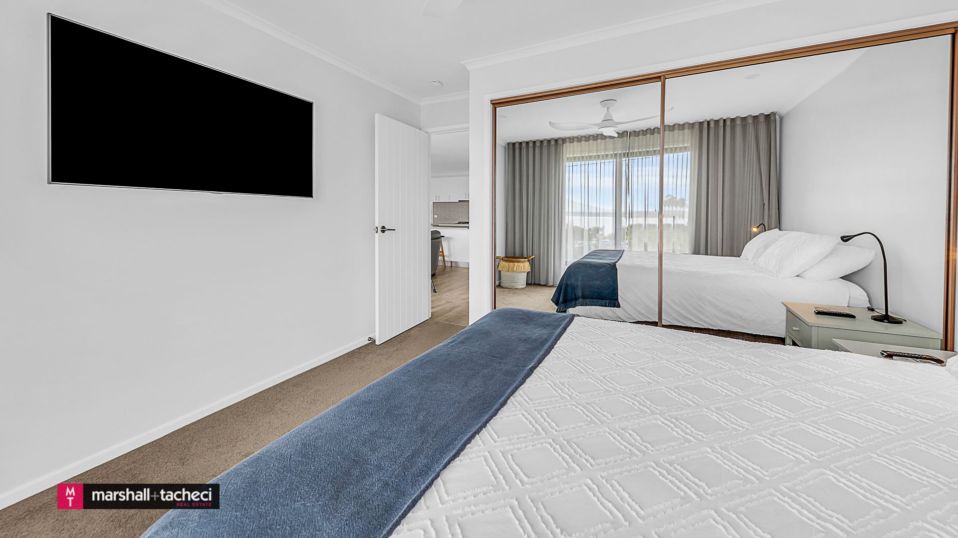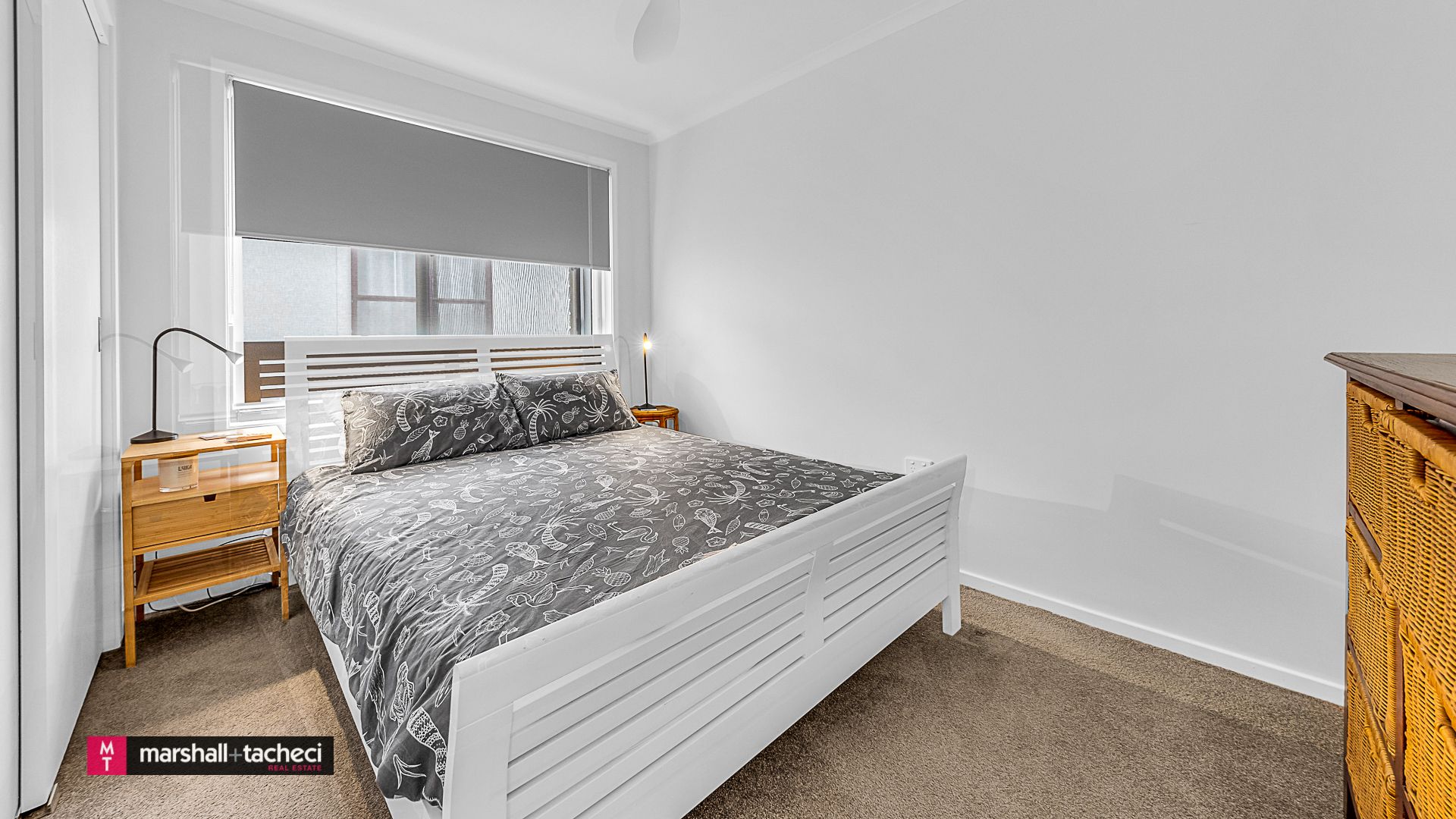 The lounge and main TV area overlooks a private garden and manicured lock up backyard. There is even a lock up double car garage to park the car, bikes or the surfboards! This area also has views to Horseshoe Bay and Guluga Mountain and can be used as an additional covered area for barbeques.