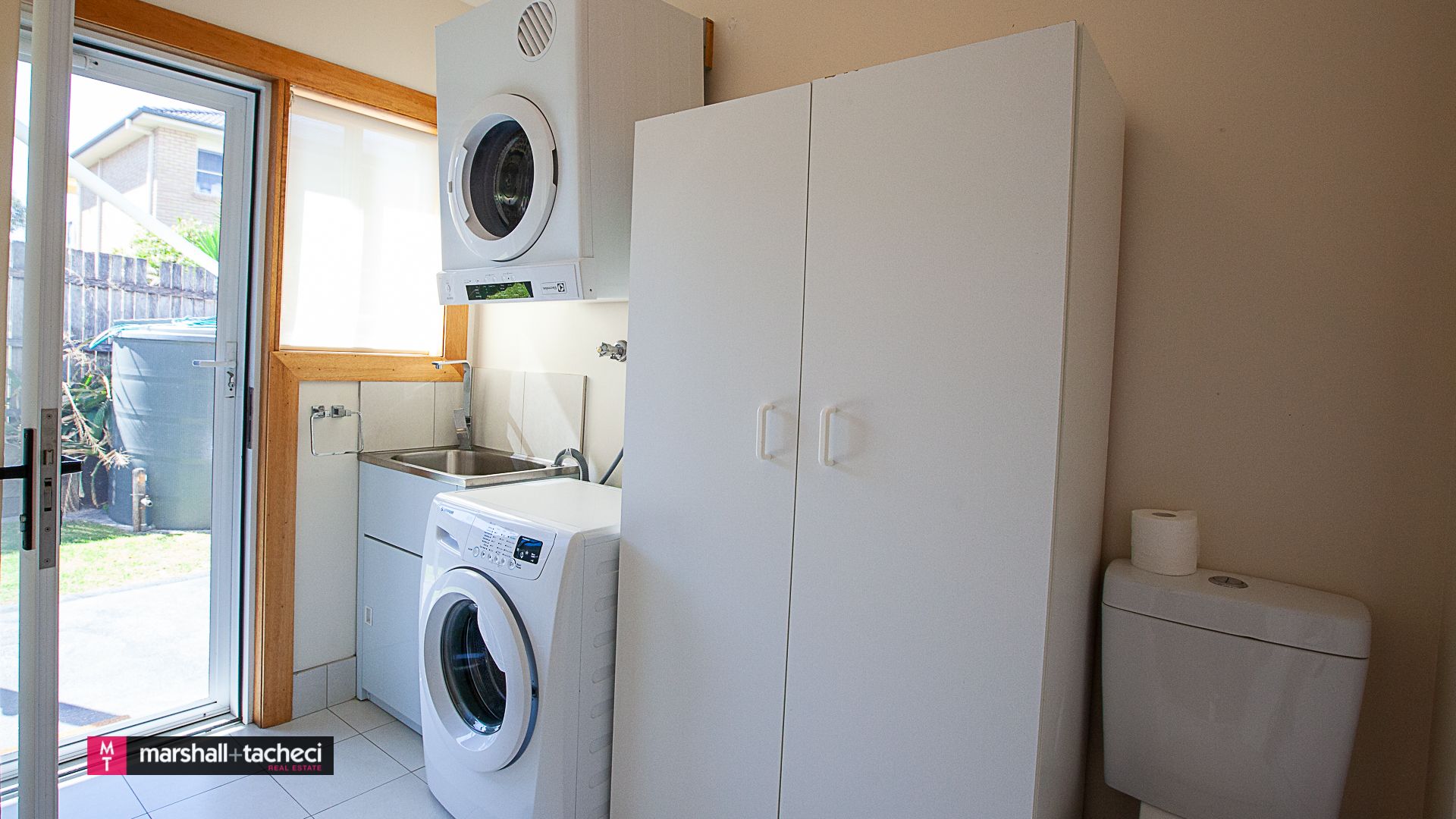 The laundry has a washer, dryer and toilet.