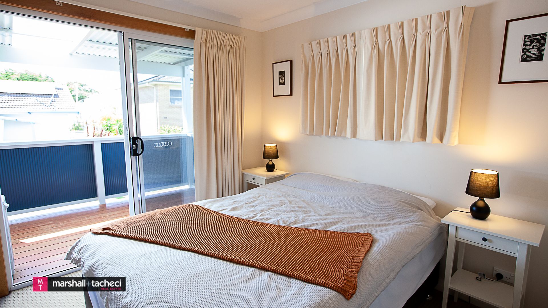 The second bedroom has a King size bed - can be made up as 2 king singles, access to the back deck with sea glimpses and sunrise views, bedside tables and reverse cycle air-conditioning.