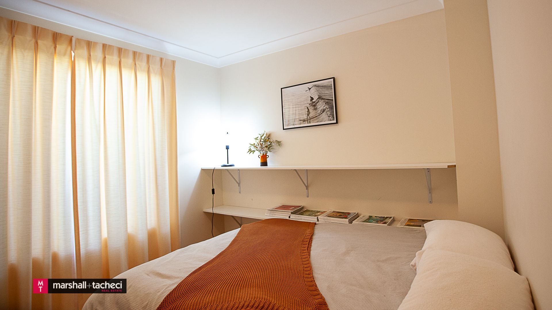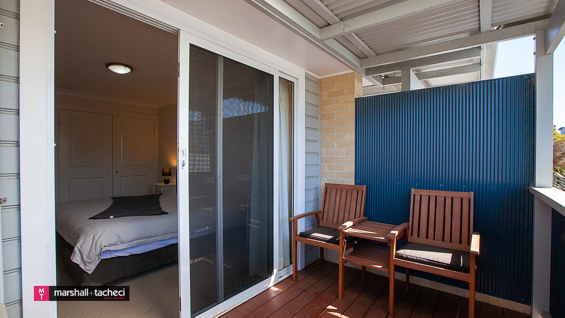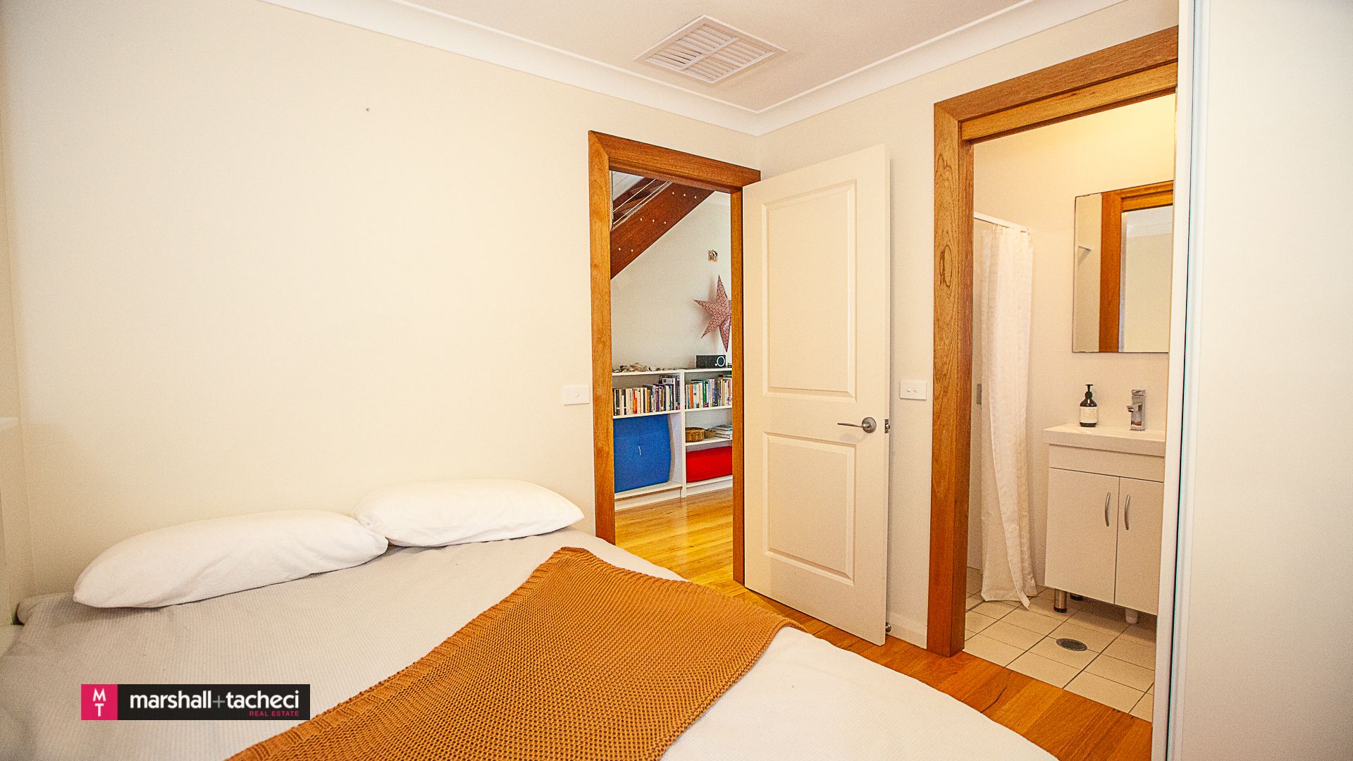 The third bedroom has a Queen size bed with bedside tables, reverse cycle air-conditioning and access to the back deck with sea glimpses and sunrise views.