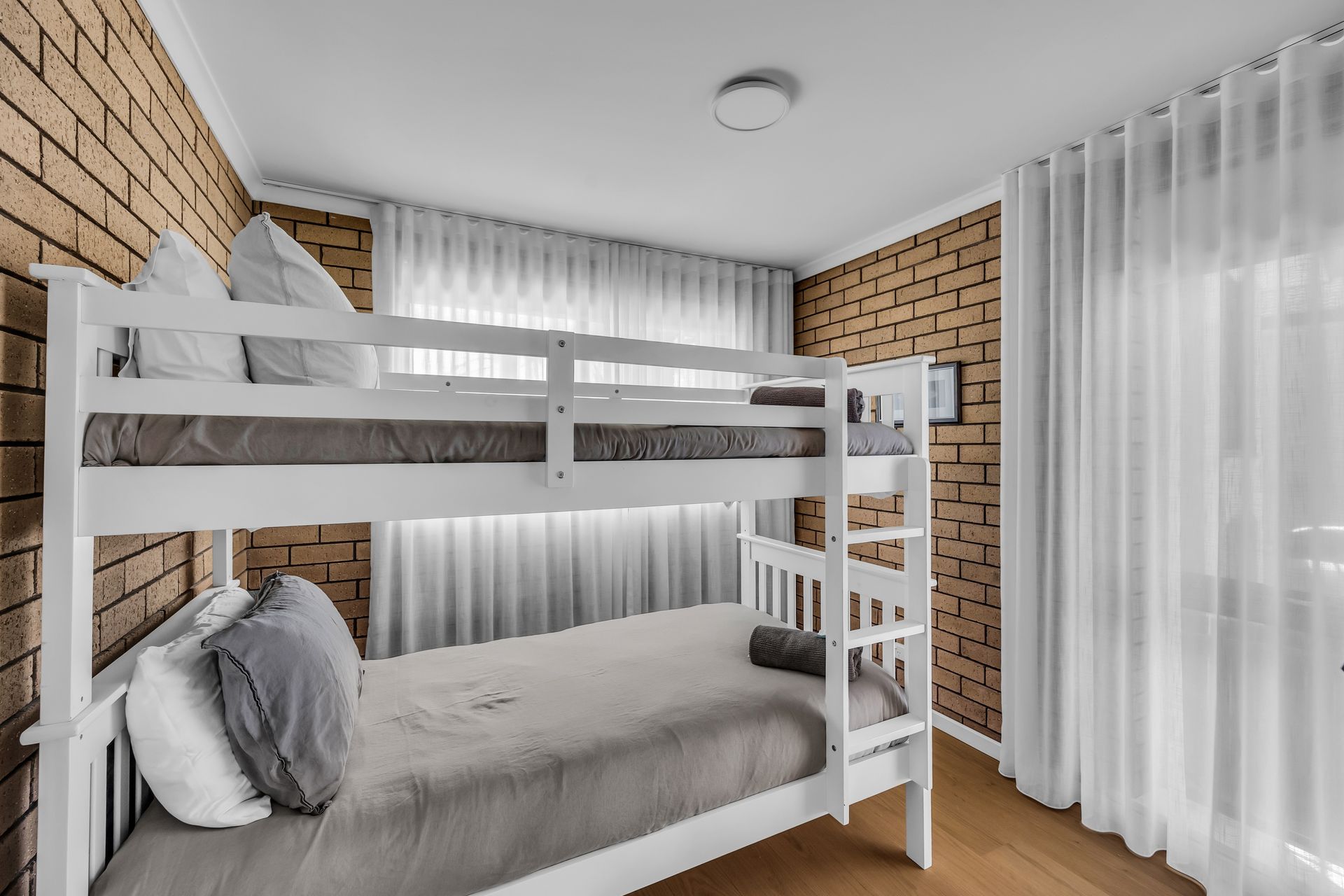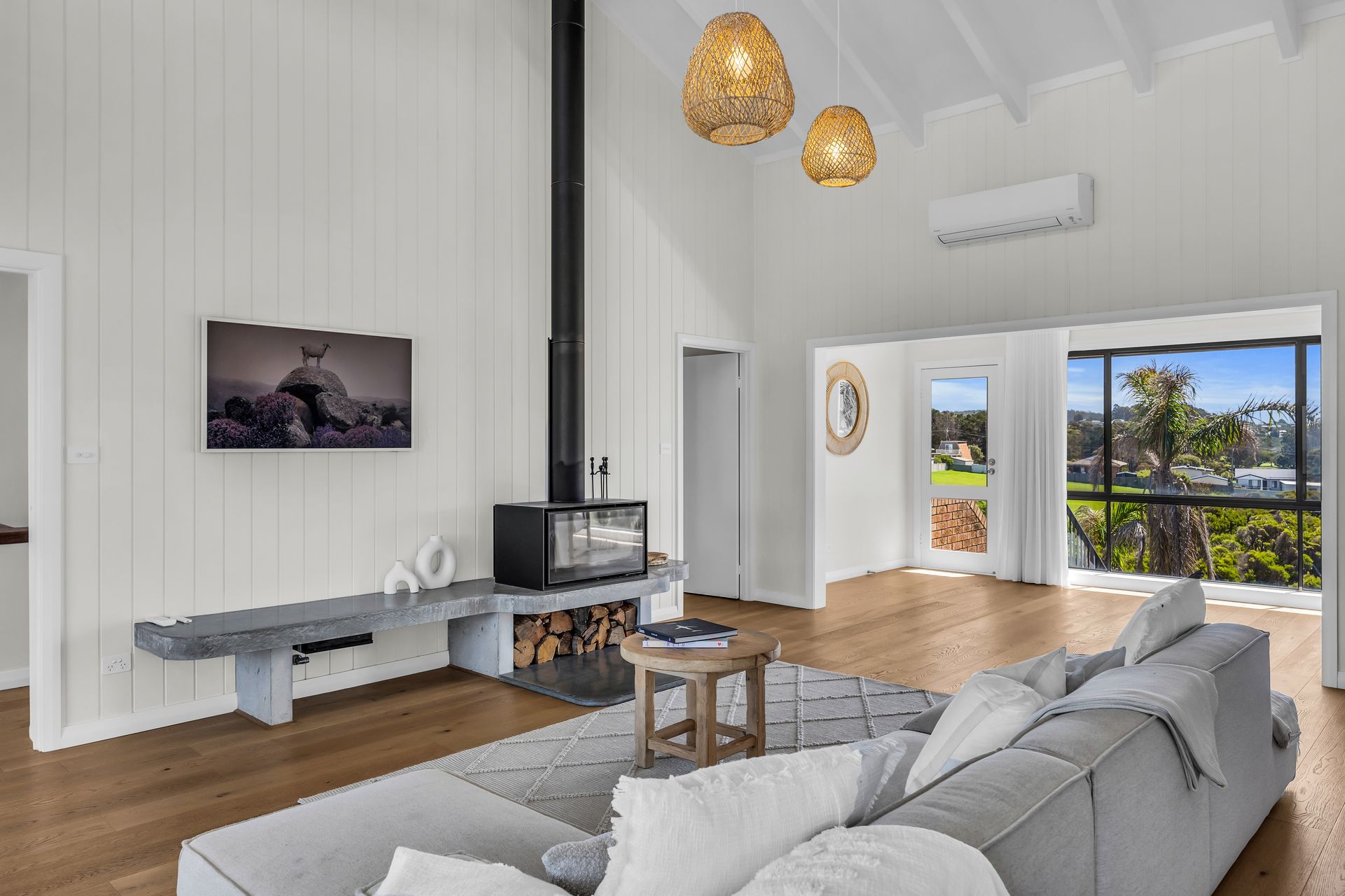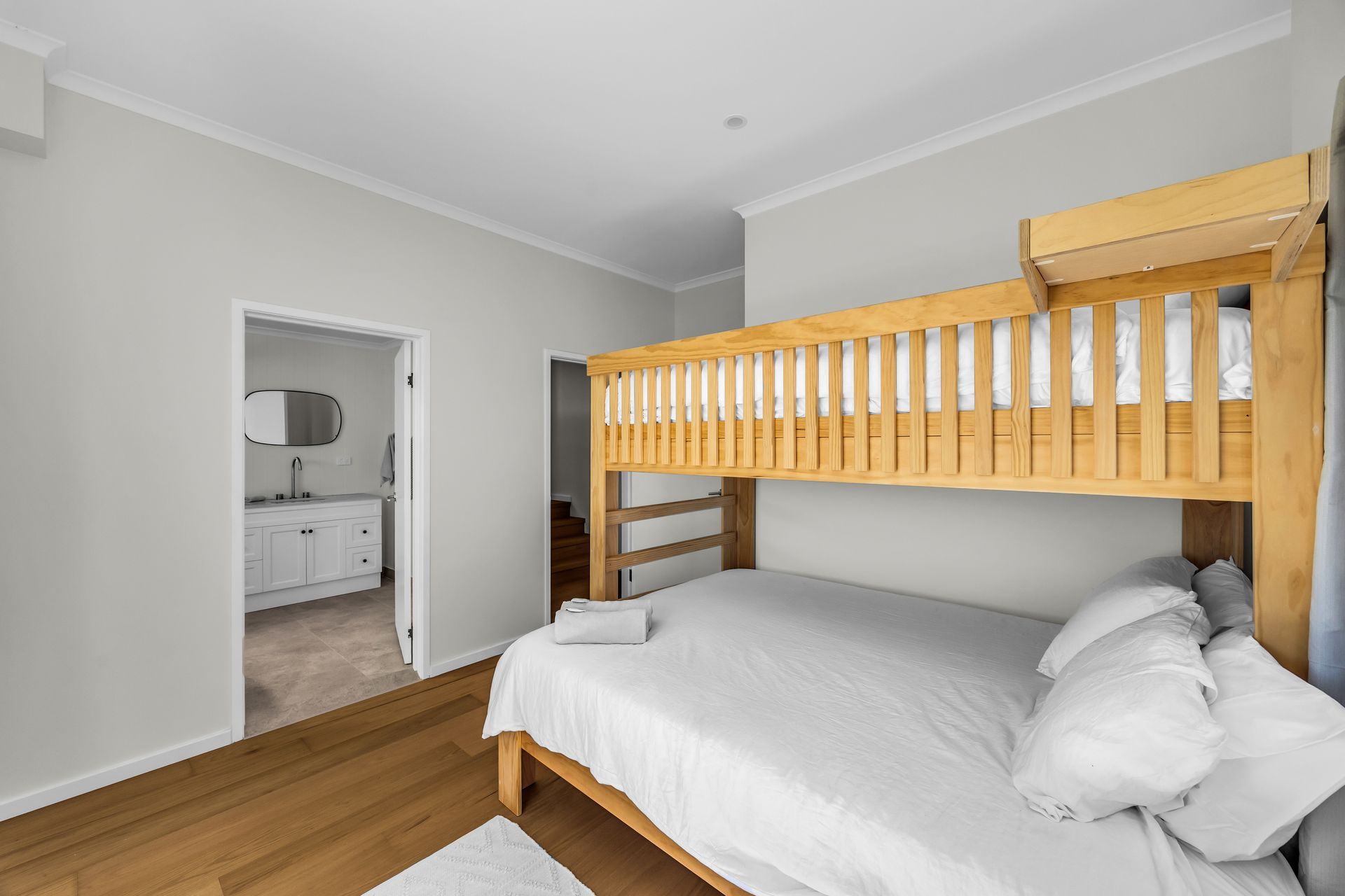 Accommodation is generous and comfortable, ensuring a restful night’s sleep to the soothing sound of the ocean. The home features four bedrooms plus a fifth bedroom with a tri-bunk, comprising three queen beds, two single beds (bunks), and a tri-bunk—ideal for families. Reverse-cycle heating and cooling in common areas, ceiling fans in upstairs bedrooms, unlimited broadband Wi-Fi, and smart TVs in living areas ensure year-round comfort.